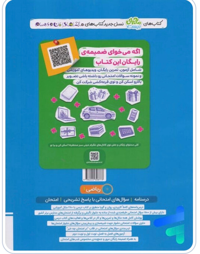 به علاوه، به تمام کار در کلاسها، فعالیتها و تمرینهای کتاب درسی در قالب مثال و سوال پرداخته شده و در نتیجه چیزی از قلم نیفتاده است. همچنین، تعدادی سوال چالشی و خلاقانه با علامت “🚀” بین سوالات هر فصل وجود دارد، این سوالات برای پیشبینی سوالات دشوار احتمالی طراحی شدهاند و مخصوص داوطلبانی هستند که به کمتر از نمره ۲٠ راضی نمیشوند.