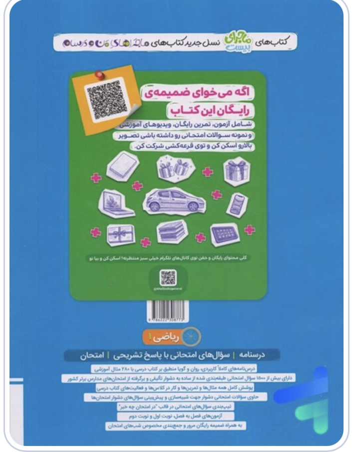 به علاوه، به تمام کار در کلاسها، فعالیتها و تمرینهای کتاب درسی در قالب مثال و سوال پرداخته شده و در نتیجه چیزی از قلم نیفتاده است. همچنین، تعدادی سوال چالشی و خلاقانه با علامت “🚀” بین سوالات هر فصل وجود دارد، این سوالات برای پیشبینی سوالات دشوار احتمالی طراحی شدهاند و مخصوص داوطلبانی هستند که به کمتر از نمره ۲٠ راضی نمیشوند.