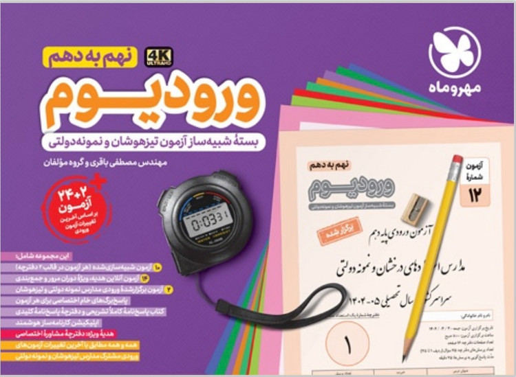 کتاب بسته شبیه ساز آزمون های ورودی مدارس نمونه دولتی و تیزهوشان نهم سری ورودیوم انتشارات مهر و ماه