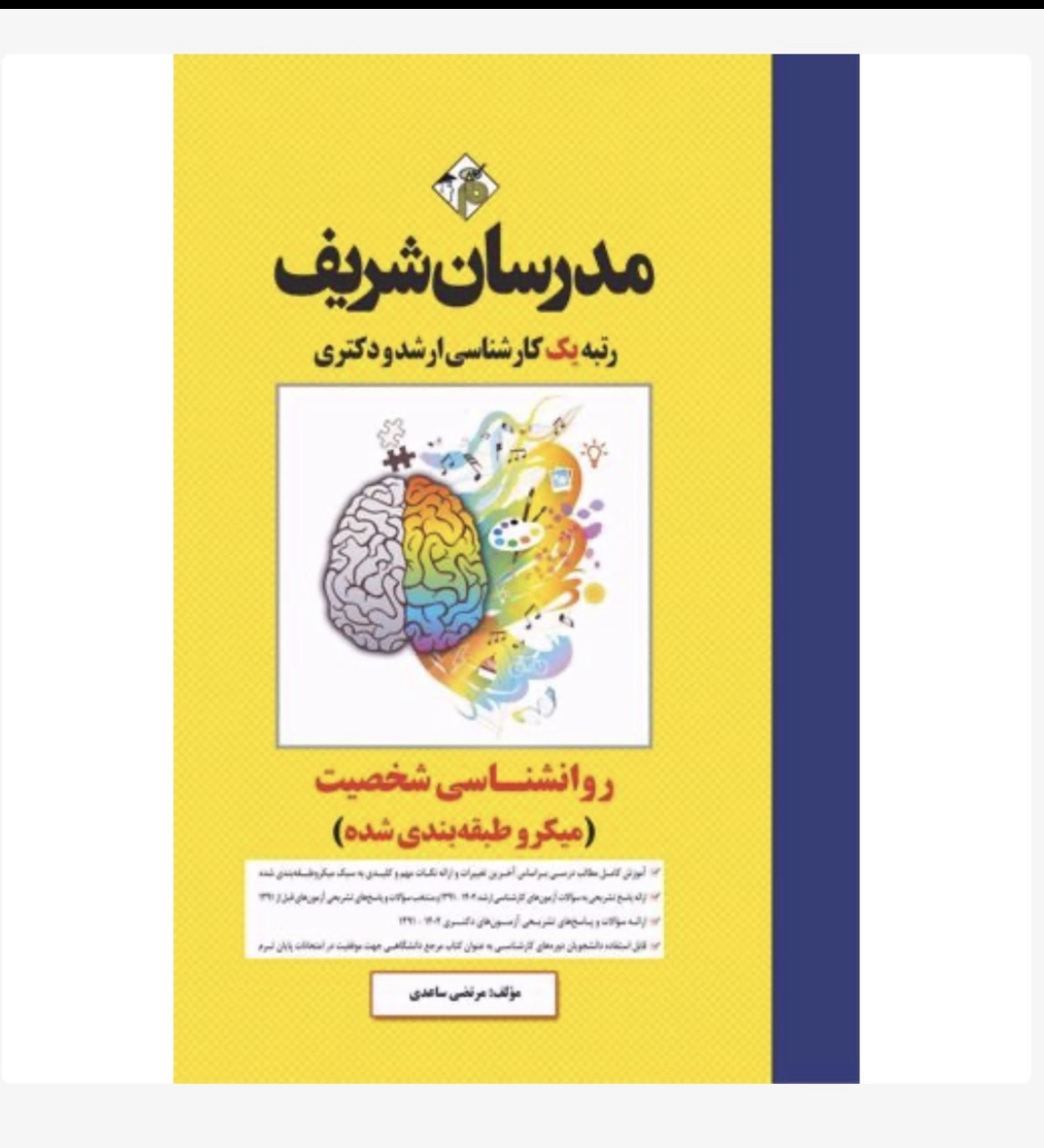 کتاب جامع روانشناسی شخصیت شامل بیست و دو فصل است، که هر فصل آن دارای درسنامه های متعددی می باشد. توضیحات داده شده با ساده ترین نثر ممکنه می باشد به طوری که برای کلیه داوطلبان با هر سطح علمی حتی داوطلبان غیرمرتبط، هم قابل فهم است. یکی از ویژگی های این کتاب وجود بیش از ۷۴۰ تست که شامل تست های تألیفی و سوالات آزمون های مقاطع کارشناسی ارشد و دکتری تا آخرین دوره برگزار شده می باشد. توضیحات داده شده برای هر تست جامع و کامل به همراه پاسخ های کاملا تشریحی است و این یکی از ویژگی های این کتاب می باشد. معمولاً داوطلبان در درک و فهم مطالب فصول دوم (نظریه ی روان کاوی فروید)، پنجم (نظریه های گسترش یافته نظریه فروید) و فصل بیست و یکم (بنیادهای زیستی شخصیت) دچار مشکل هستند. کتاب مدرسان شریف با توضیحات مفصل و ارائه تست های متعدد، این مشکل داوطلبان را برطرف نموده است. همچنین با بررسی سؤالات آزمون سال ۱۴۰۴ فصول دوم، پنجم، بیست و یکم و فصل های سیزدهم (بی. اف اسکنیز) و چهاردهم (آلبرت بندورا) جزو فصل هایی هستند که طراحان نگاه ویژه ای به آن ها دارند و شما با مطالعه این فصول، درصد بالایی در کنکور کسب خواهید کرد. در تهیه و تدوین این کتاب از بهترین و بروزترین منابع استفاده شده و بهترین منبع برای آزمون ها می باشد.